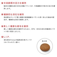 原材料 小麦粉、肉類(鶏、七面鳥、ダック)、米、コーン、動物性油脂、小麦、超高消化性小麦タンパク(消化率90%以上)、ビートパルプ、加水分解タンパク(鶏、七面鳥)、魚油(EPA/DHA源)、大豆油、酵母および酵母エキス、サイリウム、フラクトオリゴ糖、加水分解酵母(マンナンオリゴ糖源)、ルリチシャ油、マリーゴールドエキス(ルテイン源)、緑茶抽出物(ポリフェノール源)、アミノ酸類(L-チロシン、L-リジン、タウリン、DL-メチオニン、L-カルニチン)、ミネラル類(Ca、Na、Cl、P、K、Zn、Mn、Fe、Cu、Se、I)、ビタミン類(コリン、E、C、ビオチン、A、パントテン酸カルシウム、B6、ナイアシン、葉酸、B12、B1、B2、D3)、保存料(ソルビン酸カリウム)、酸化防止剤(ミックストコフェロール、ローズマリーエキス)