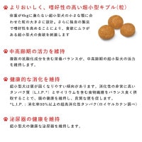 体重4未満の超小型犬の小さな顎に合わせてキブル(粒)の大きさを調整。さらに独自の製法で食欲にムラがある超小型犬の食欲を刺激。