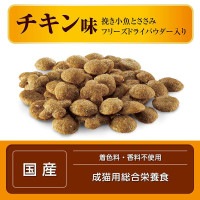 猫が大好きなチキンの旨みが詰まった粒に、挽き小魚と微粉砕したささみフリーズドライをまぶした高い嗜好性