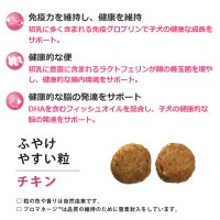原材料 チキンミール(ヒスチジン源)、コーングルテン、鶏脂、さとうもろこし、米、とうもろこし、チキンエキス、シュガービートパルプ、家禽類、ひまわり油(リノール酸源)、イヌリン、フィッシュオイル(DHA源)、初乳(ラクトフェリン、免疫グロブリン源)、ビタミン類(A、B1、B2、B6、B12、D3、E、コリン、ナイアシン、パントテン酸、葉酸)、ミネラル類(亜鉛、カリウム、カルシウム、クロライド、セレン、鉄、銅、ナトリウム、ヨウ素、リン)、酸化防止剤(BHA、BHT、クエン酸、ミックストコフェロール、ローズマリー抽出物)
