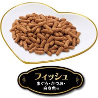 原材料 穀類(とうもろこし、菓子粉、コーングルテンミール、等)、肉類(ミートミール、チキンミール、等)、豆類(おから、脱脂大豆、等)、魚介類(フィッシュミール:DHA・EPA源 、フィッシュエキス、まぐろエキス、かつおエキス、白身魚エキス、等)、油脂類(動物性油脂、ガンマ-リノレン酸、等)、ビール酵母、卵類(ヨード卵粉末)、ビタミン類(A、D3、E、K3、B1、B2、パントテン酸、ナイアシン、B6、葉酸、ビオチン、B12、コリン、イノシトール)、ミネラル類(カルシウム、リン、ナトリウム、カリウム、塩素、鉄、コバルト、銅、マンガン、亜鉛、ヨウ素)、アミノ酸類(メチオニン、タウリン)、着色料(赤103)、酸化防止剤(ローズマリー抽出物、ミックストコフェロール)
