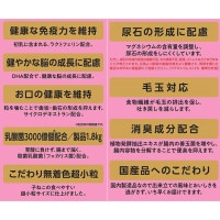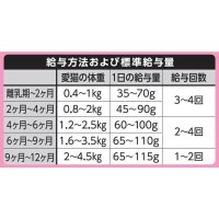 原材料 穀類(とうもろこし、コーングルテンミール、小麦粉、小麦ふすま等)、肉類(ミートミール、チキンミール、ポークミール、チキンレバーパウダー)、豆類(乾燥おから、脱脂大豆)、魚介類(フィッシュエキス、フィッシュミール、フィッシュパウダー)、油脂類(動物性油脂、植物性油脂、フィッシュオイル(DHA源として))、セルロース粉末(食物繊維源として)、ビール酵母、酵母細胞壁、環状イソマルトオリゴ糖(サイクロデキストラン)、植物発酵抽出エキス、ラクトフェリン、殺菌乳酸菌、ミネラル類(カルシウム、リン、カリウム、鉄、亜鉛、銅、ヨウ素)、ビタミン類(A、D、E、K、B1、B2、B6、葉酸、コリン)、アミノ酸類(メチオニン、タウリン)、pH調整剤