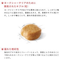 ヨークシャーテリアのあごでも簡単に捉えられて、しっかりと噛めるように設計された、最適な大きさ、形、食感のキブル(粒)です。しっかり噛むことで、歯石の形成を抑えます。