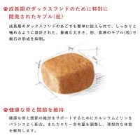 成長期のダックスフンドのあごでも簡単に捉えられて、しっかりと噛めるように設計された、最適な大きさ、形、食感のキブル(粒)で、歯石の形成を抑制。